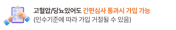 | 2대질병특정치료비(상급종합병원,권역심뇌혈관질환센터)(연간1회한)(간편) | 보험기간 중 약관에서 정한 "2대질병"의 직접적인 치료를 목적으로 "2대질병 특정치료"를 받은 시점 기준 상 급종합병원 또는 권역심뇌혈관질환센터에서 "2대질병 특정치료"를 받은 경우 보험가입금액 지급(연간 1회한, 계약일부터 경과기간 1년 미만시 보험가입금액의 50%지급)