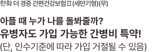 | 간병인사용입원생활비(요양,정신,한방병원제외,연간181일이상)(간편) | 보험기간 중 질병 또는 상해의 직접 결과로써 생활기능 또는 업무능력에 지장을 가져와 요양병원,정신병원 및 한방병원을 제외한 의료기관에 연간 181일이상 입원하여 치료를 받으며 간병인을 사용하여 실질적으로 간병서비스를 이용한 경우 보험가입금액(간병인 사용금액이 1일당 7만원 미만인 경우 보험가입금액의 50%) 지급(연간 180일을 초과하여 간병인을 사용한 입원 1일당,지급일수는 연간 185일 한도)